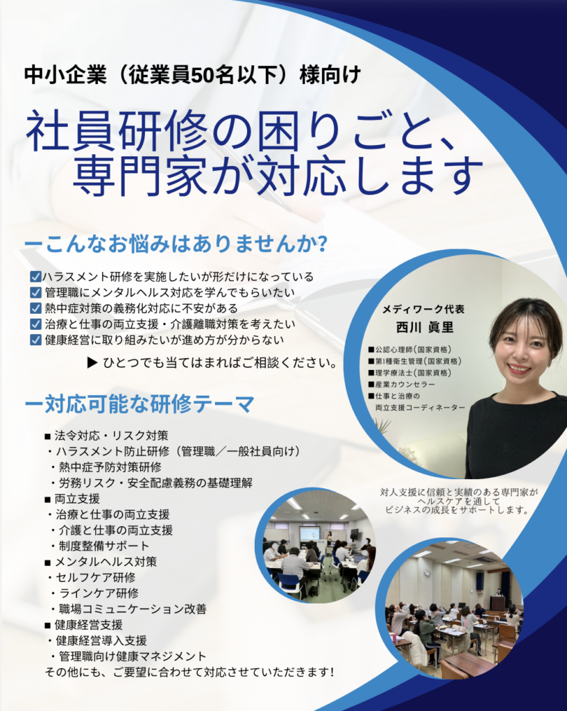 メディワークでは健康経営をサポートする専門家としての立場から、様々なメンタルヘルス対策や研修を提供しています。今回は、メンタルヘルスについてのサービスをご紹介させていただきます!